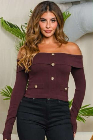 Blusa café off shoulder con botones tipo joya que estiliza la cintura y resalta los hombros. Perfecta para looks de noche, cenas y outfits elegantes con mucho estilo. Confeccionado en 80% viscosa y 20% Nylon.